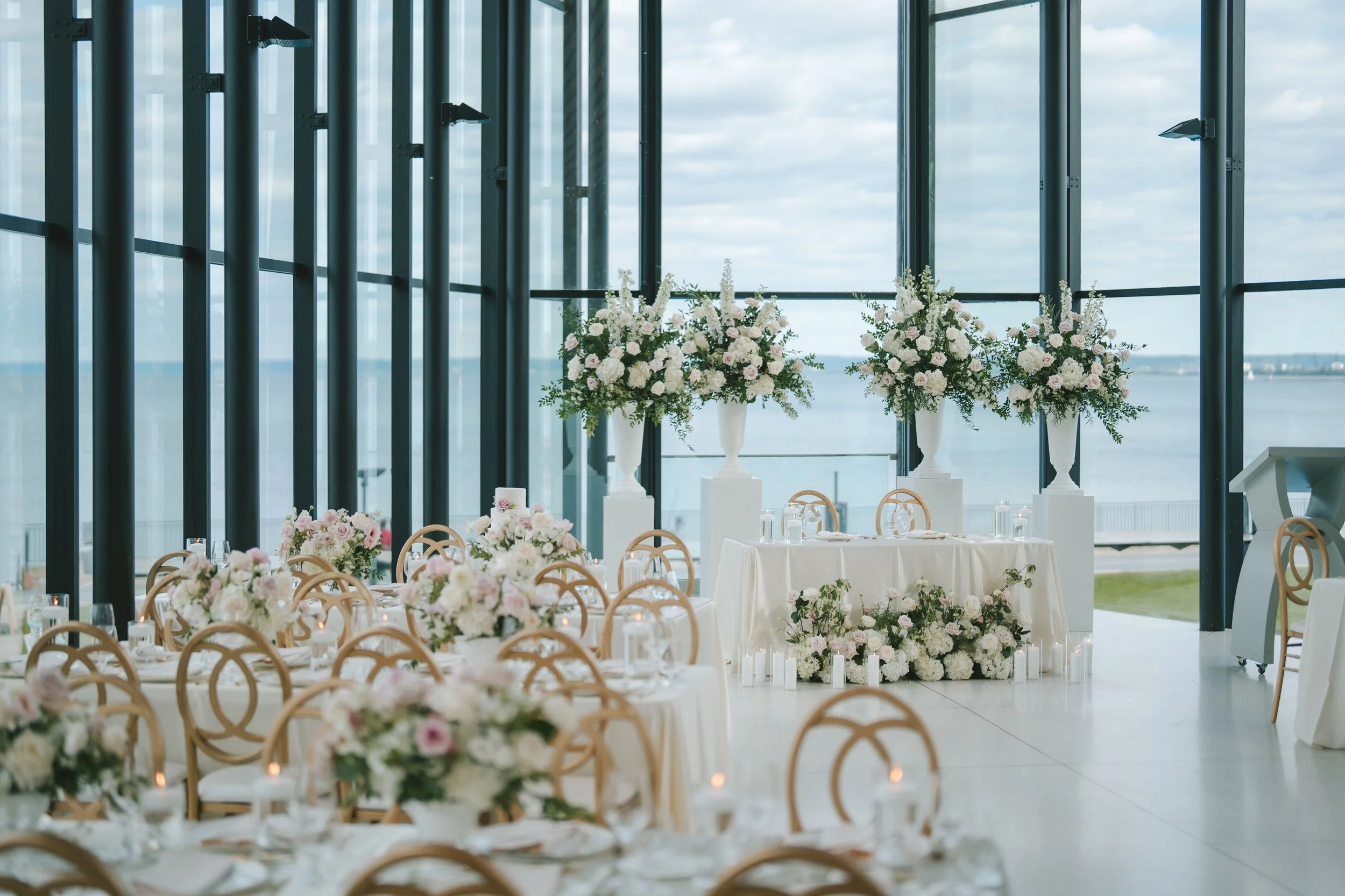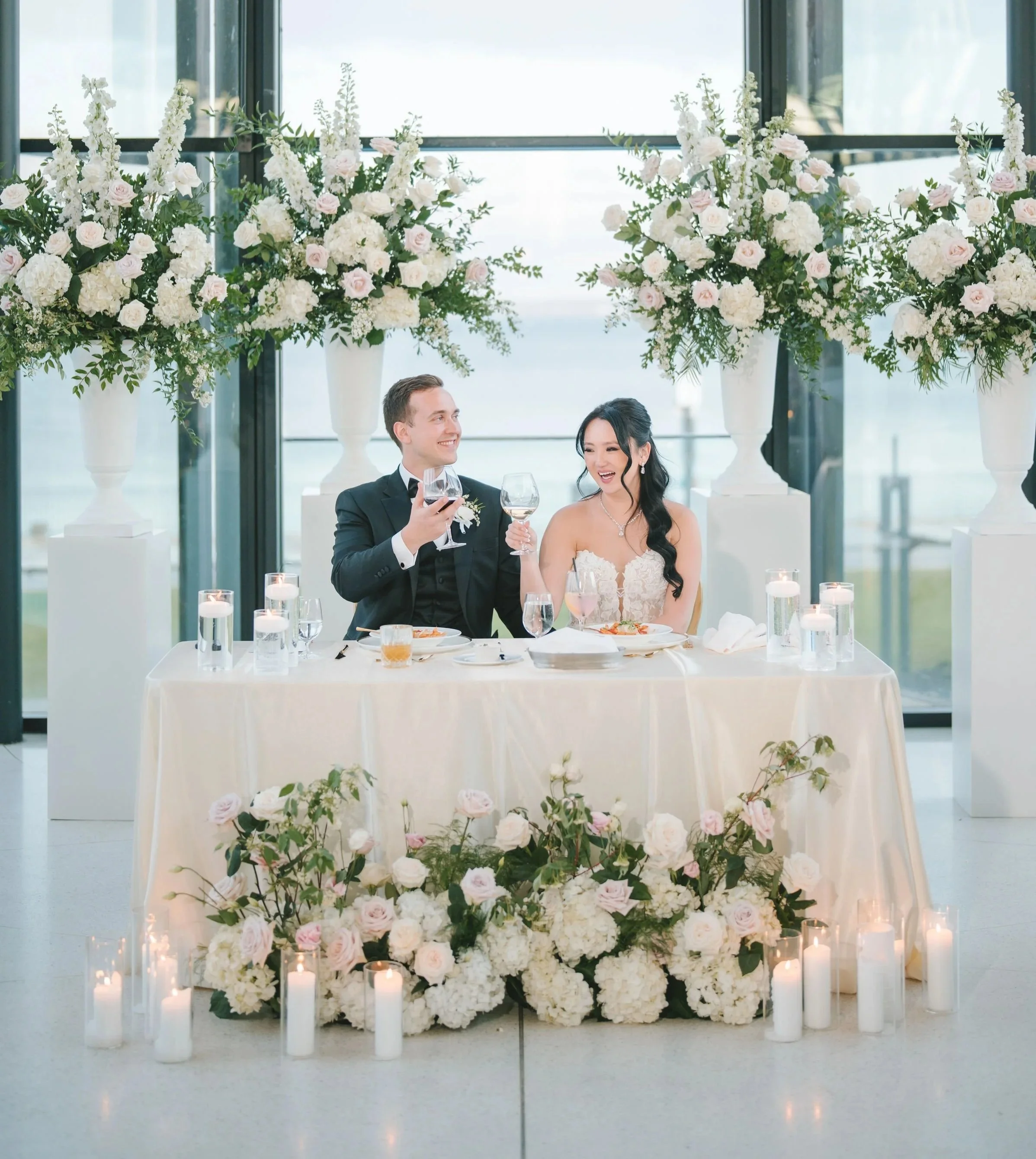 Our florals were lush, vibrant, and meticulously thought out. From the breathtaking floral pillars she designed to the modern statement pieces for our bar and seating chart, every detail was beyond my wildest expectations. These elements became the focal points of our modern wedding theme, and they completely elevated the look and feel of our day.”